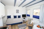 Ein Einraum Apartment für eine Person. In der ersten Etage gelegen erwartet Sie ein heller freundlicher Raum mit Küchenzeile, Sitzecke und Boxspringbett. Wir verzichten auf Teppichboden und haben uns für Vinyl Laminat entschieden. Zu dem Apartment gehört ein großzügiger Balkon mit Sitzmöbeln und Sonnenliege. Das Bad bietet Dusche/WC einen Fön und hat ein Fenster. Handtücher, Bett- und Tischwäsche werden vom Vermieter gestellt. Haus Frisia bedeutet, Sie genießen Urlaub bei Juistern und können sich rundum Wohlfühlen.